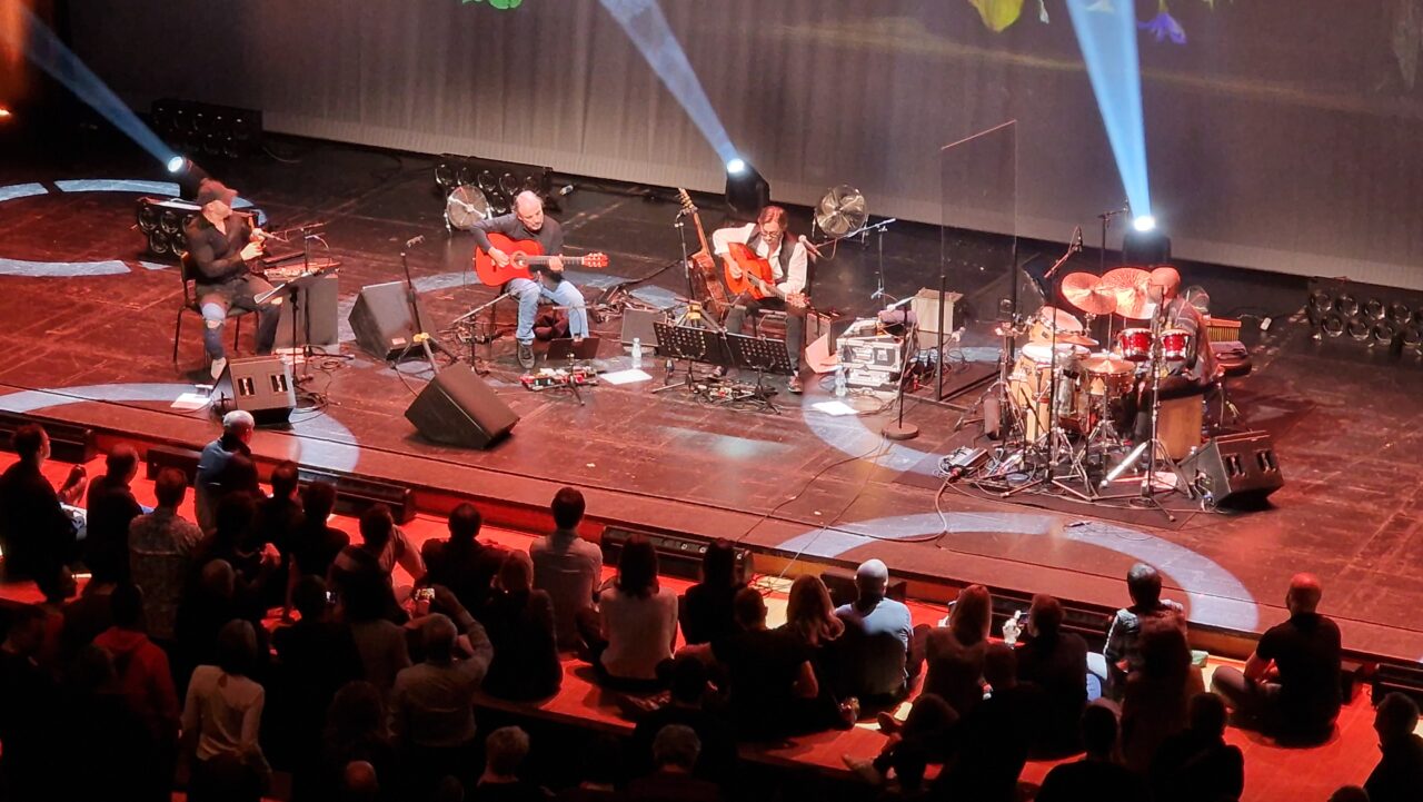 Vrnimo se v Cankarjev dom, kjer je Al v družbi italijanskega kitarista Pea Alfonsija in španskega tolkalca (bobni, cajón) Sergia Martineza odigral skladbe z množice različnih albumov. Začeli so z The Infinite Desire, zadržano in nesproščeno, vrhunska tehnika se je pokazala šele kasneje. V prvih dveh skladbah je bilo kar nekaj netočnosti, brenčanja in škripanja, kar me je precej presenetilo. Podobno kot dejstvo, da je vztrajno strmel v notna črtovja pred sabo, kar menda v želji po brezhibnih izvedbah pogosto počne. Spremljevalca na odru papirjev nista potrebovala, vsak, ki je kdaj igral po notah, pa dobro ve, koliko energije ti to odvzame. Novinarsko mesto sem ponovno dobil visoko na prvem balkonu in malce umaknjeno pod drugi balkon, tako da moje ocene morda niso povsem korektne, saj zvok tam ni najboljši. Al kompleksnost igranja glasbenikov na odru rešuje s prostorom, »stereo« tehniko, ki jo je prevzel od Beatlesov, kar so lahko doživeli samo oboževalci sredi dvorane (morda, če je bilo ozvočenje ustrezno). S perspektive obiskovalca je igral Peo na levi in Segio na desni. Upam, da so ta element ujeli snemalci Prvega programa Radia Slovenija, ki so koncert posneli in ga bodo predvajali v enem od prihodnjih Sobotnih glasbenih večerov. Kolikokrat je Al (kljub papirjem pred sabo) zaprl oči in kitaro prepustil srcu, od tam zgoraj ni bilo možno videti.