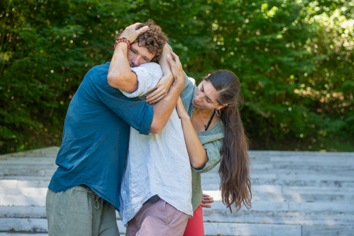 Med poletjem sem si imela priložnost ogledati dve izvedbi performansa z naslovom Asimetrija objema. Performans premišljuje enega izmed vsakdanjih, vendar intimnih načinov srečanja – objem. Objeto je lahko telo, glava, pramen las, gleženj ali stopalo. Objeta je lahko veja, deblo ali del stebra. Ob opazovanju gibanja se vzbudijo prijetni občutki ter spoznanje, kako lepo je, da se lahko drug drugemu in okolici prilegamo na toliko različnih načinov.