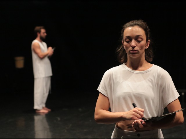 Da bo fizična plat predstave opazno povezana z njenim opisom, postane jasno že na začetku, ko nastopajoča zarisujeta krog na list papirja, medtem pa krožita okoli svoje osi, predstavljajoč telesi, ki sta ujeti v neskončno kroženje. Nato se plesalca pomakneta v prostor, kjer s svojim gibanjem zarišeta veliko krožnico, ki lepo zapolni prostor in ostane v naših mislih tudi, ko se gibanje pomakne izven nje. Zarisovanje krožnice v prostoru še podpre odločitev za bele kostume, kar nastopajočim hkrati pomaga, da se ne izgubijo v popolnoma črni dvorani Plesnega teatra. Tako kot krožna kompozicijska struktura, je tudi gibanje ves čas zgrajeno na osnovi kroženja. V prvem delu predstave gre predvsem za dejansko premikanje po tirnici kroga, v drugem delu, ko se nastopajoča premakneta tudi izven te oblike, pa idejo podpira že od začetka prisotno vztrajno ponavljanje določenih vzorcev ali fraz. Vseprisotno ponavljanje je dobra osnova stopnjevanju napetosti, ki se stopnjuje z zahtevnostjo ter hitrostjo gibanja; od preprostega teka fraze preidejo v vedno bolj kompleksne. Ko napetost naraste do vrhunca, Jerca Rožnik Novak na oder zaluča riž, ki ga nato uporabita za vidno risanje prej utirjenih krožnic in tokrat popolnoma zapolni prostor. Ta prelom predstavlja prerez harmonije repetitivnosti, začne se iskanje izhoda iz neskončnega kroga. Fraze se še vedno držijo principa ponavljanja, a postanejo manj tekoče. Kot odziv na poskus izstopa iz kroga pride do kontakta med vsemi tremi nastopajočimi na odru. Poleg plesalcev je na odru ves čas tudi tolkalist Kai Strobel, ki izvaja glasbo v živo. Prav pridružitev glasbenika, ki prej s plesalcema nima fizičnega stika, še bolj poudari glasbo kot del predstave, ne le kot njeno spremljavo. Zaradi močne prepletenosti glasbe in plesa to idejo pokvari trenutek, ko se začne predvajati posneta glasba in prekine kontinuiteto, ki je bila ustvarjena. Koreografija je fizično zelo zahtevna, a sta ji plesalca vsekakor kos. Dobro se poigravata tudi s spreminjajočo se dinamiko, hkrati pa se zdi, da ostaja enaka prav zaradi neprestanega ponavljanja, ki služi kot nekakšno skrito ogrodje celotne koreografije. Gibi so čisti in jasni, plesalcema uspe celo, da so kljub mehkobi videti tudi ravno prav čvrsti, da ne izpadejo površni. Vlogi sta v celoti enakomerno porazdeljeni, vendar nam pogled vedno znova vleče na plesalko, ki nas s svojo čisto in energetično izvedbo ter opazno prezenco vedno znova privabi, da jo spremljamo. Tako morda nehote postane protagonistka, ko se predstava prevesi v manj harmoničen del.