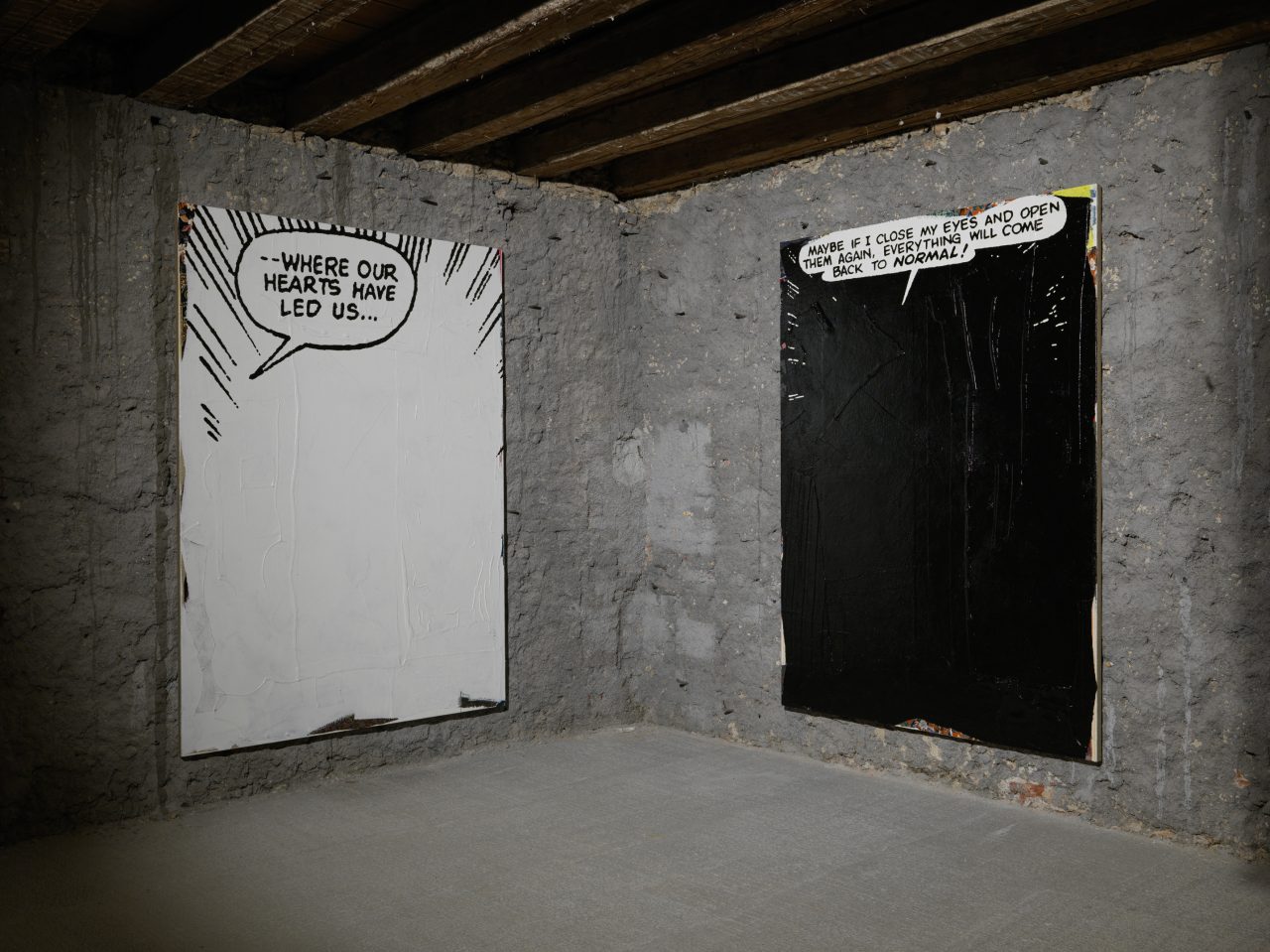 Na sliki Ko ne voli karanfile, ne voli ni ljude je izpod vrhnjega barvnega nanosa viden vzorec zgolj na dveh manjših mestih. S tem namiguje, da zgornji nanos morda zakriva tudi druge informacije o sliki. This story is no longer available uporabi nanos črne barve na podoben način, poleg tega pa centralizira besedilo »this story is no longer available« (»ta zgodba ni več na razpolago«) in s tem tudi jasno tematizira zamujanje časovno omejenih stanj. Na delih –WHERE OUR HEARTS HAVE LED US… in BACK TO NORMAL! govorni oblački ustvarjajo vtis pripovednega dogajanja, ki ni prikazano, zaradi stripovskih črt, ki so usmerjene proti sredini, ob njunih robovih, pa bi gledalec pričakoval osrednjega govorca, ki tudi ni prikazan. Sliki namigujeta, da sta besedili vzeti iz prej obstoječega stripa, zgodba katerega obiskovalcu razstave ni na voljo.