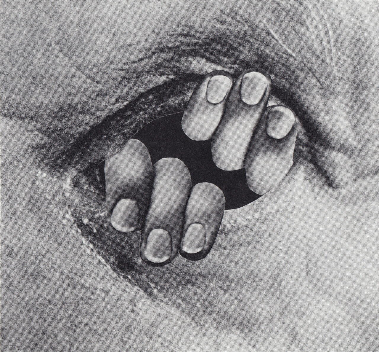 Nenazadnje bi opomnila še na delo Nemirno oko, kolaž, po katerem razstava tudi nosi ime. To je črno bel kolaž očesa, iz katerega rinejo prsti. Delo manjše dimenzije je stalo samostojno na eni izmed sten, pobarvani v temno modro barvo, ki je delovala kot povezovalni element razstave in spremljajoče vizualne komunikacije.