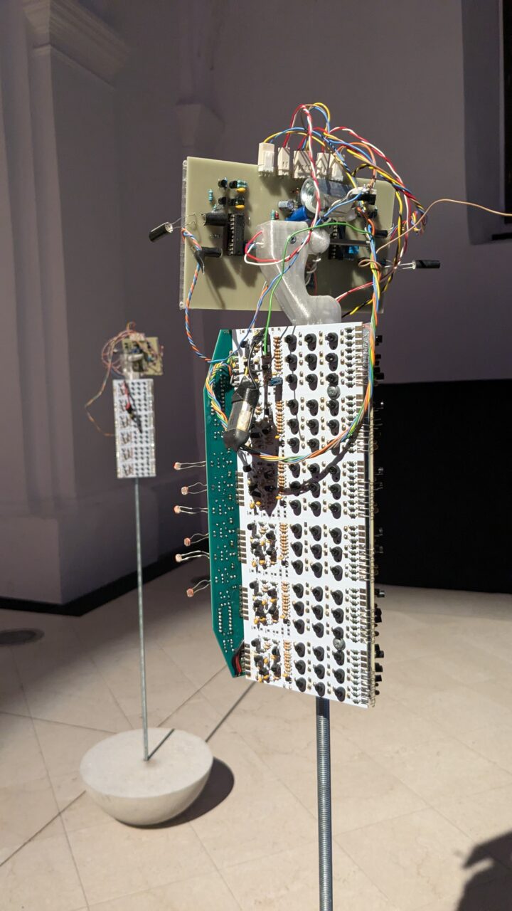 V nasprotju z bolj arhivsko predstavitvijo projekta Megla je medij se ideja nevidnih tehnoloških struktur na osrednji razstavi najbolj jasno artikulira pri Stašu Vrenku. Pragovi prečeni je instalacija, sestavljena iz elektronskih modulov, povezanih v medsebojno odvisen sistem. Enote so opremljene s svetlobnimi senzorji in lastnim virom energije, ki temelji na svetlobnem napajanju, zato njihovo delovanje neposredno pogojuje količina svetlobe v prostoru. Ko obiskovalec stopi bliže in s telesom zasenči posamezen modul, se spremeni vhodni signal; sistem to zazna in sproži drugačno zaporedje utripov, zvokov in premikov. Gre za preprosto, a jasno logiko povratne zanke. Sprememba v okolju povzroči odziv, ta pa vpliva na nadaljnje ravnovesje celote. Delo tako brez didaktične razlage pokaže, kako delujejo tehnološki sistemi – kot mreže zaznavanja, procesiranja in odzivanja, v katerih je uporabnik neizogiben del enačbe.