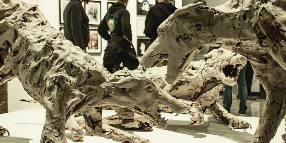 Daleč najbolj(še) izpostavljeno delo na bienalu je bila skulptura Nike Rosman, umetnice, ki deluje na presečišču ilustracije in keramičnega oblikovanja. Njeno monumentalno instalacijo iz keramike in kovine je bilo mogoče uzreti že iz ulice in predstavlja enega najatraktivnejših del na bienalu. Instalacija z izčiščeno estetiko združuje dvoje stopnic, keramične in kovinske, ki se združujejo v eno, skupaj pa tvorijo obliko (neuporabnega) tobogana. Keramične stopnice so na zunanjih stranicah obdane s sinje modrimi ploščicami, ki gledalca z mislimi prestavijo ob bazen, spodnja stranica pa je oblečena v ogledalo, ki delo opolnomoči z dodatno prostorsko dimenzijo. Umetnica z instalacijo nadgrajuje svoje ilustrativno delo, ki ga prenaša v tridimenzionalni prostor. Med skulpturalnimi deli je izstopalo tudi delo Kaje Horvat, ki predstavlja zmes sestavljenih materialov: žice, gipsa, vrvi in kovin. S surovimi materiali je umetnica sooblikovala živalske podobe, v medsebojnem dialogu in aktivnih pozah, vendar ponekod brez okončin, napol razpadle in srhljivo distopične. Tudi pri intuitivnemu sestavljanju, postopnemu združevanju materialov in hkratnemu ohranjanju njihove surovosti, je mogoče iskati vzporednice z ilustrativnimi pristopi, ki so na prvi pogled morda nekoliko nejasne.